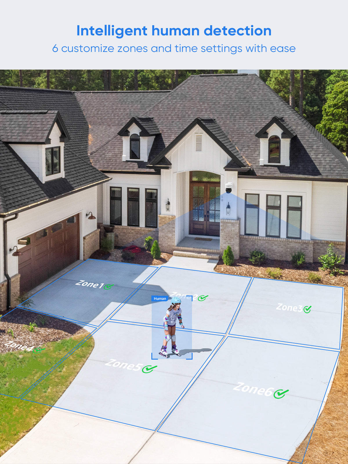 Equipped with the latest AI algorithms, the security camera is capable of recognizing a human among all objects and sends you instant app pushes & email alerts.